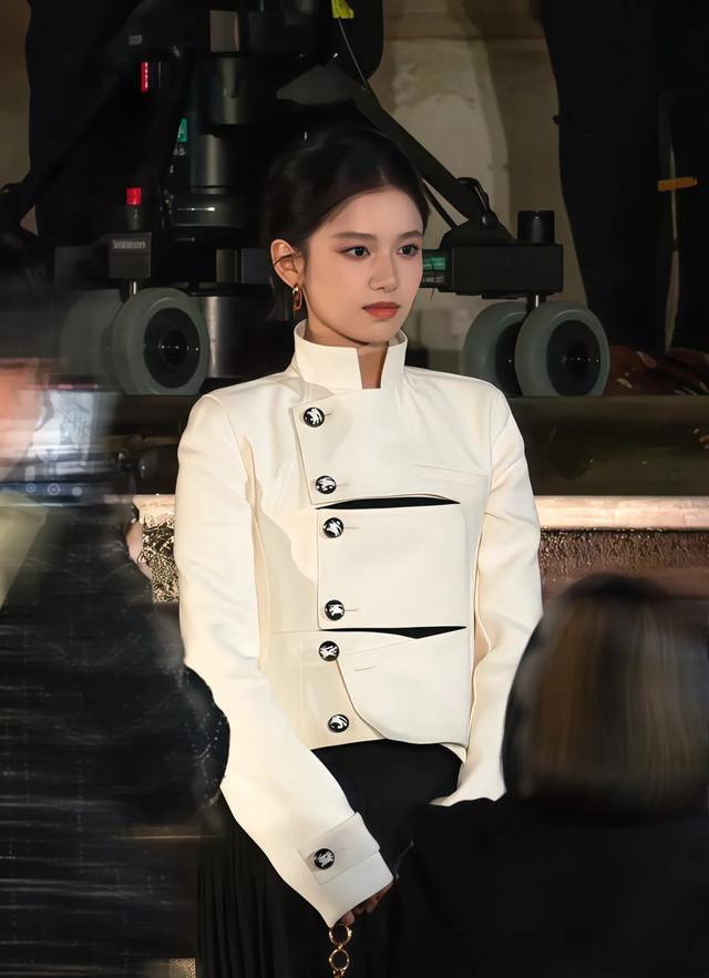 张婧仪白色立领上衣搭配黑色纱裙,画上精致的妆容高挺的鼻梁,皮肤白皙透亮好高贵的一张脸富家千金既视感拉满。
